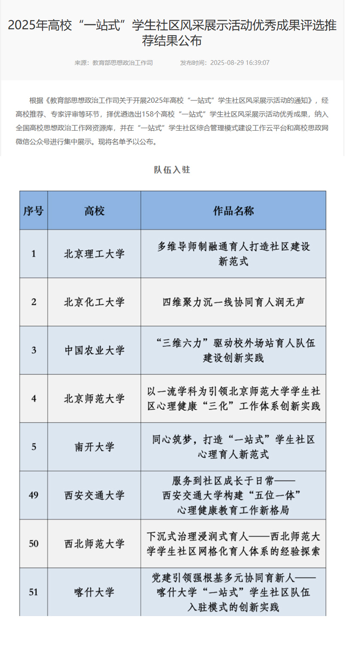 西北师大社区网格化育人工作入选2025年教育部全国高校“一站式”学生社区优秀成果
