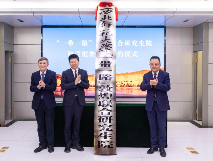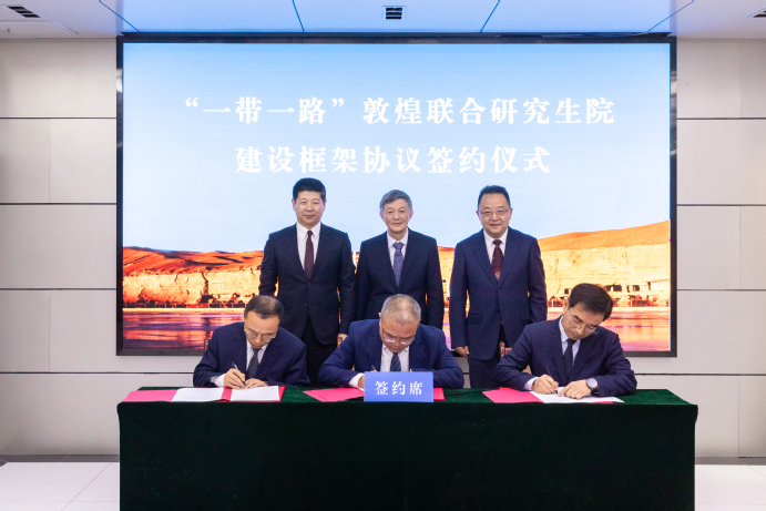 党委书记贾宁,敦煌研究院院长苏伯民,酒泉市委常委、敦煌市委书记王彦群共同为“一带一路”敦煌联合研究生院揭牌。副校长张明军,敦煌研究院党委委员、副院长赵林毅,敦煌市委常委、常务副市长付虎代表三方签署“一带一路”敦煌联合研究生院建设框架协议。